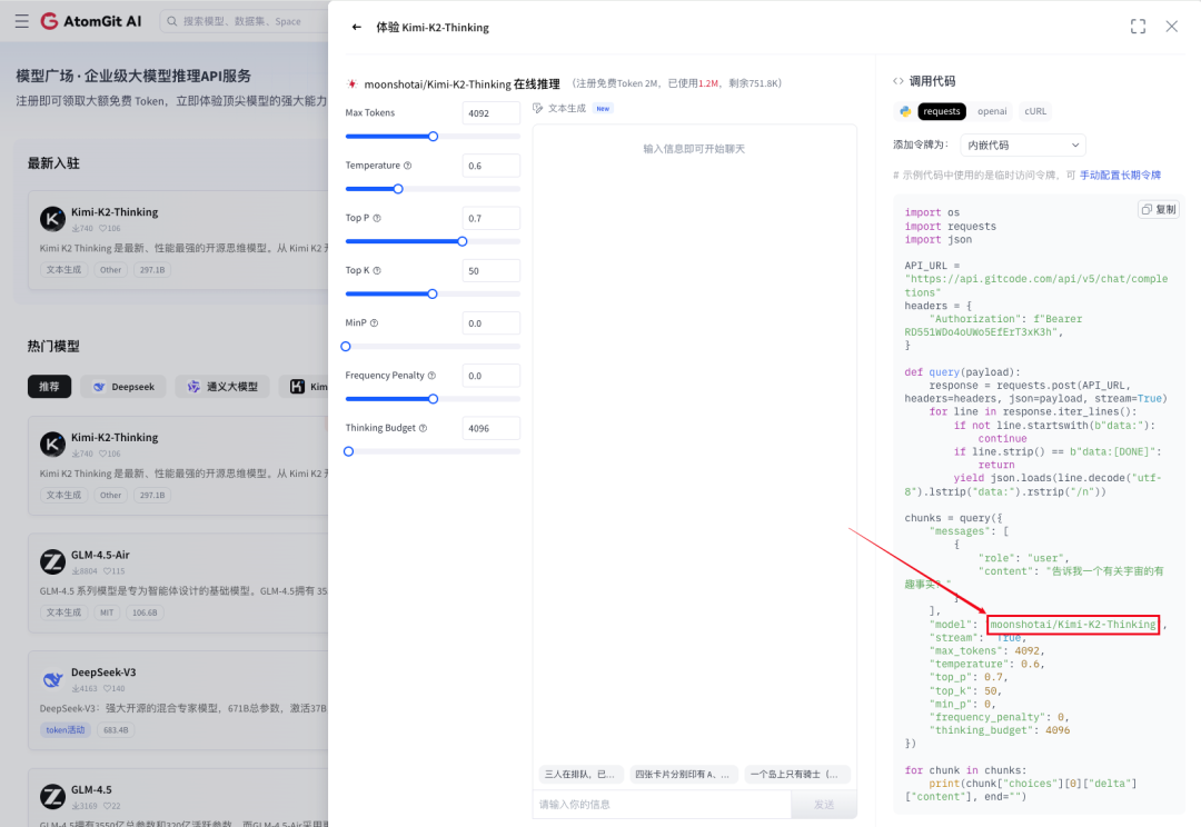 模型广场-在线体验:https://ai.gitcode.com/serverless-api?model=Kimi-K2-Thinking