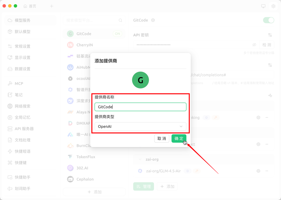 在弹窗中输入自定义的提供商名称,提供商类型保持默认的【OpenAI】,随后点击【确认】即可完成添加。