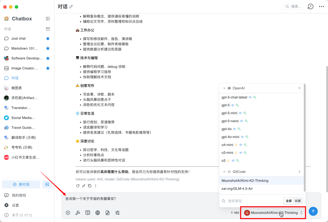 在 Chatbox AI 首页即可进行对话体验,同时可以自由切换多个已成功添加的模型:
