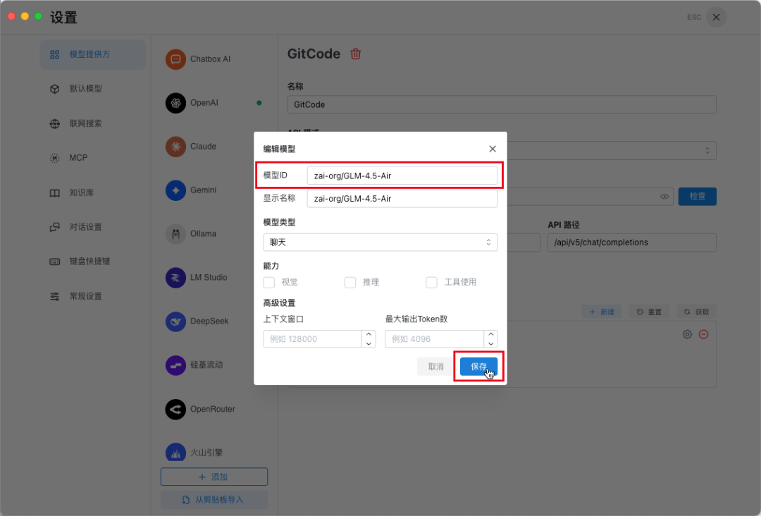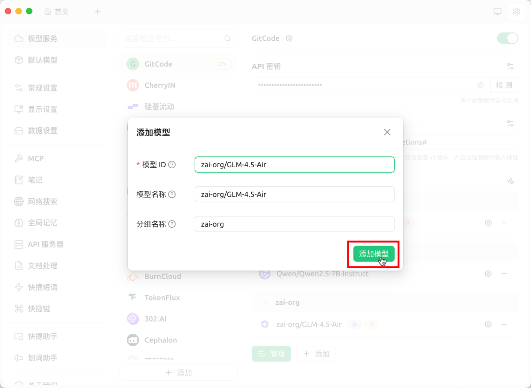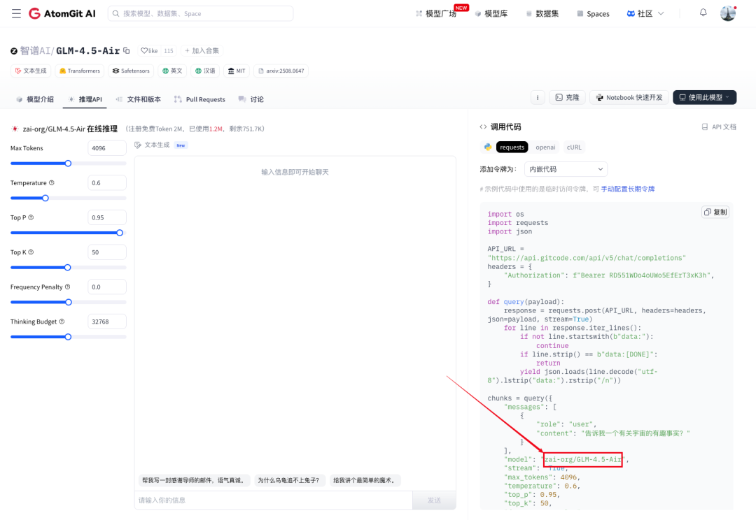 模型详情页-推理API:https://ai.gitcode.com/zai-org/GLM-4.5-Air/model-inference