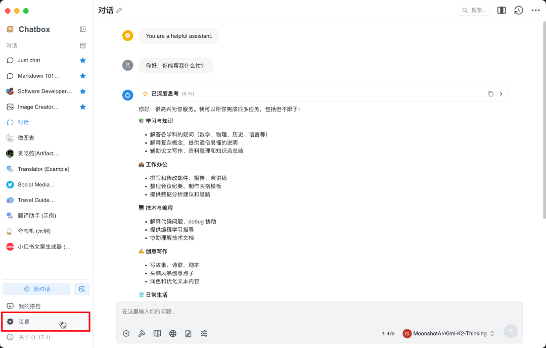 安装成功后打开 Chatbox AI,点击左下角「设置」进入设置界面;