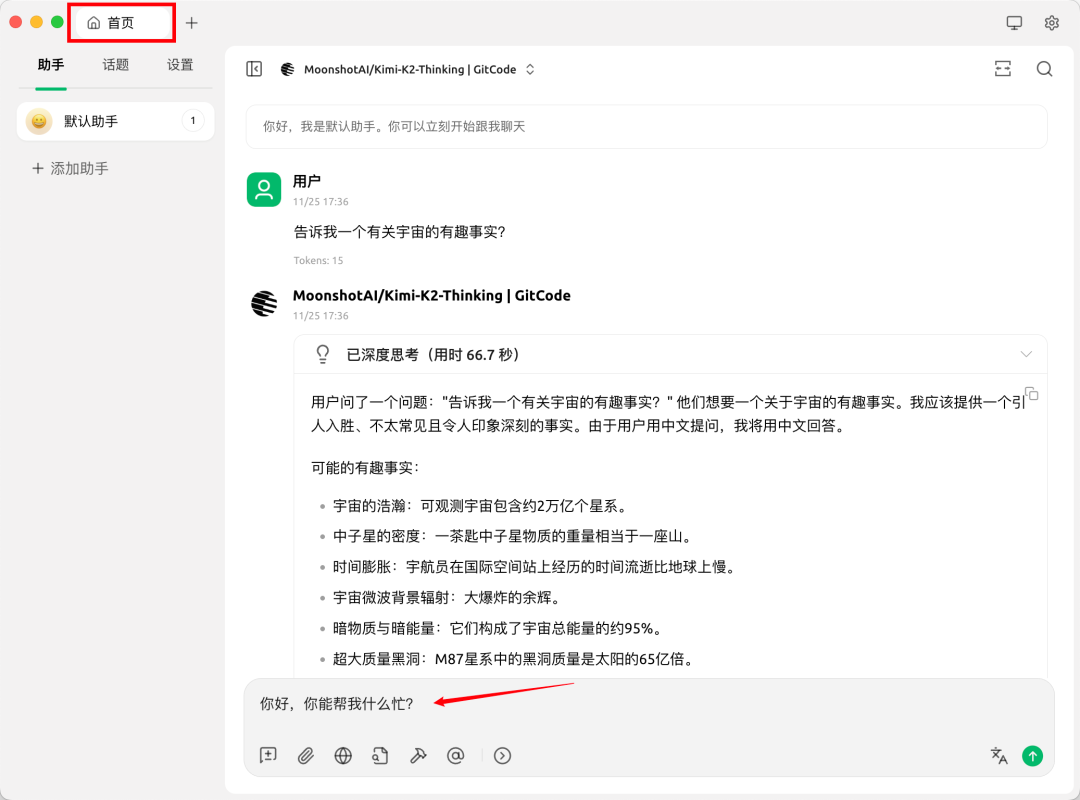 配置成功后即可在 Cherry Studio 首页体验和使用模型: