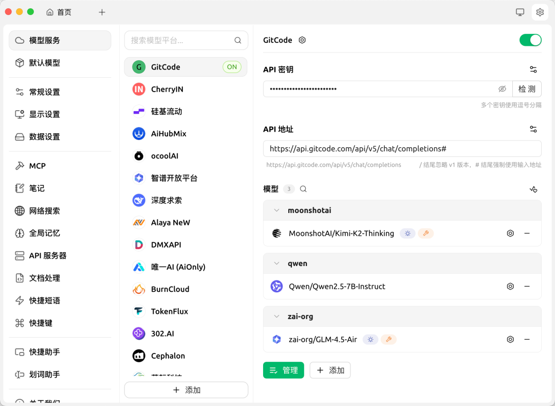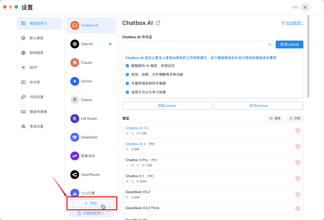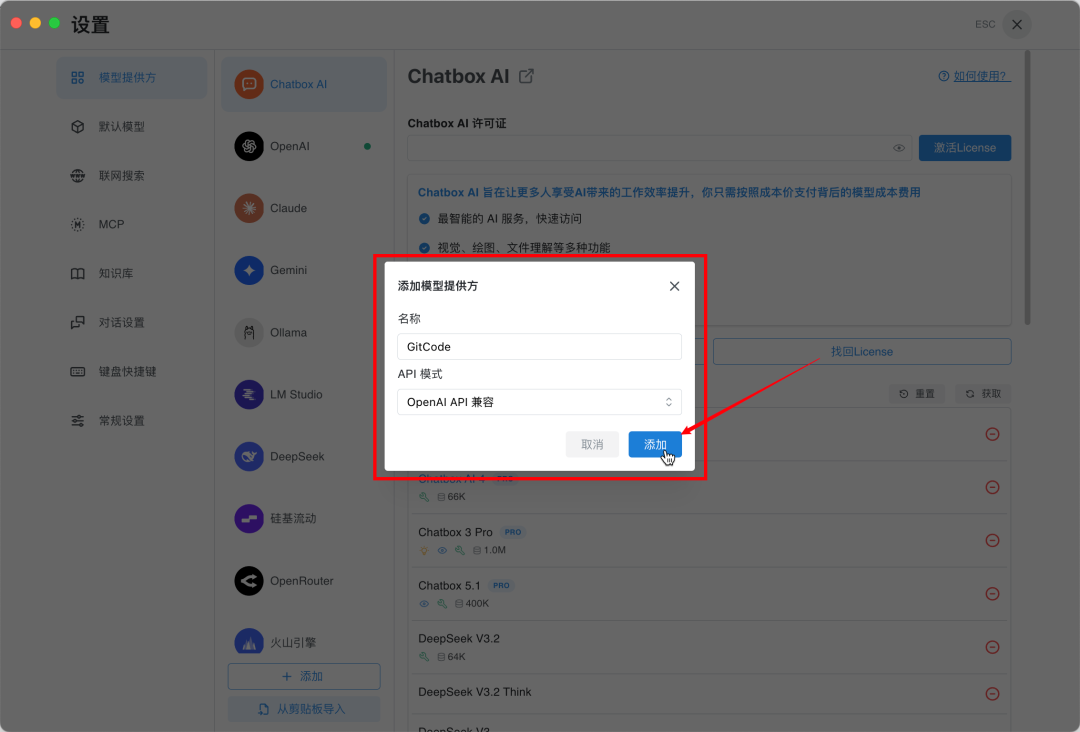 进入设置界面后,在左侧菜单中找到【模型提供方】并点击【添加】: