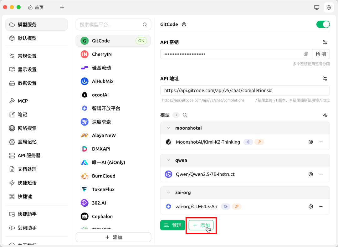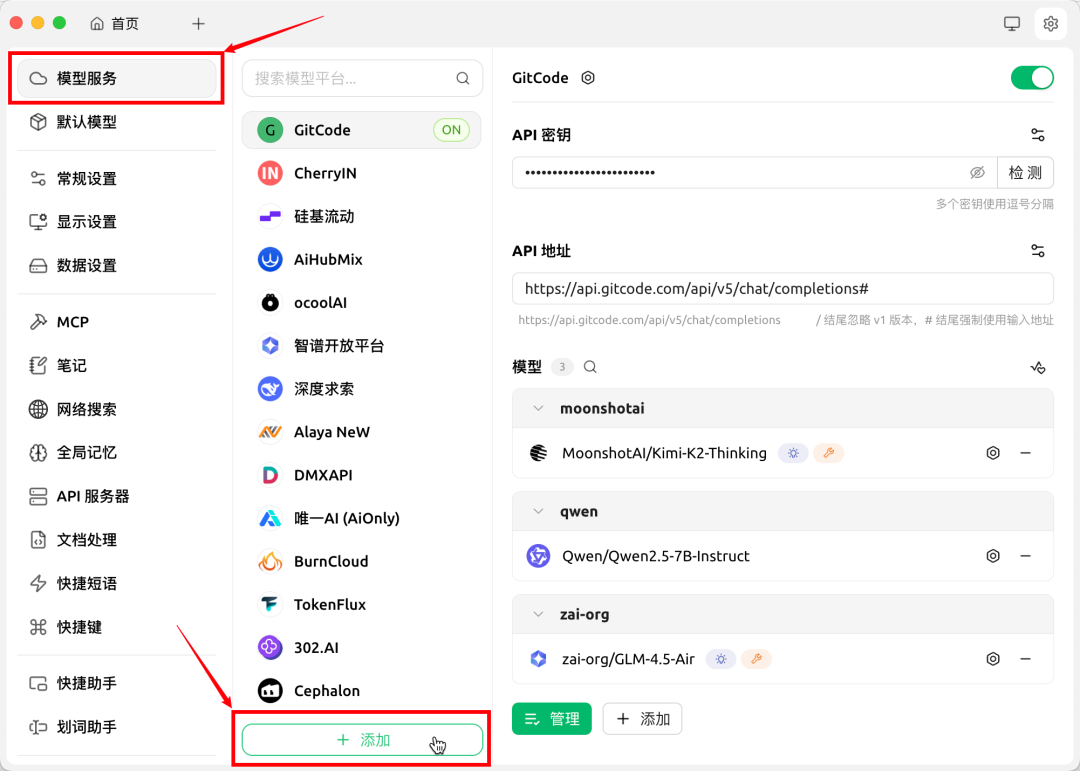 进入设置界面后,在左侧菜单中找到【模型服务】并点击【添加】: