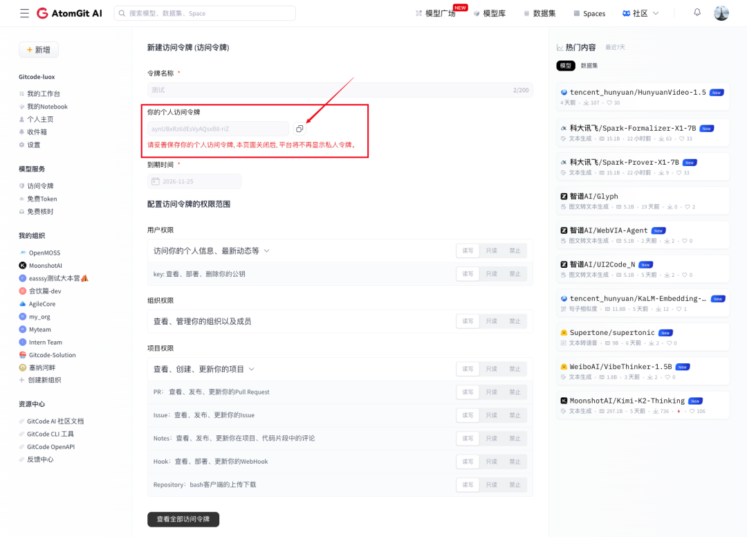 API 密钥:在AI 社区个人工作台新建访问令牌,新建成功后复制填入【API 密钥】即可(新建成功请立即复制,页面关闭后将无法访问该令牌!);