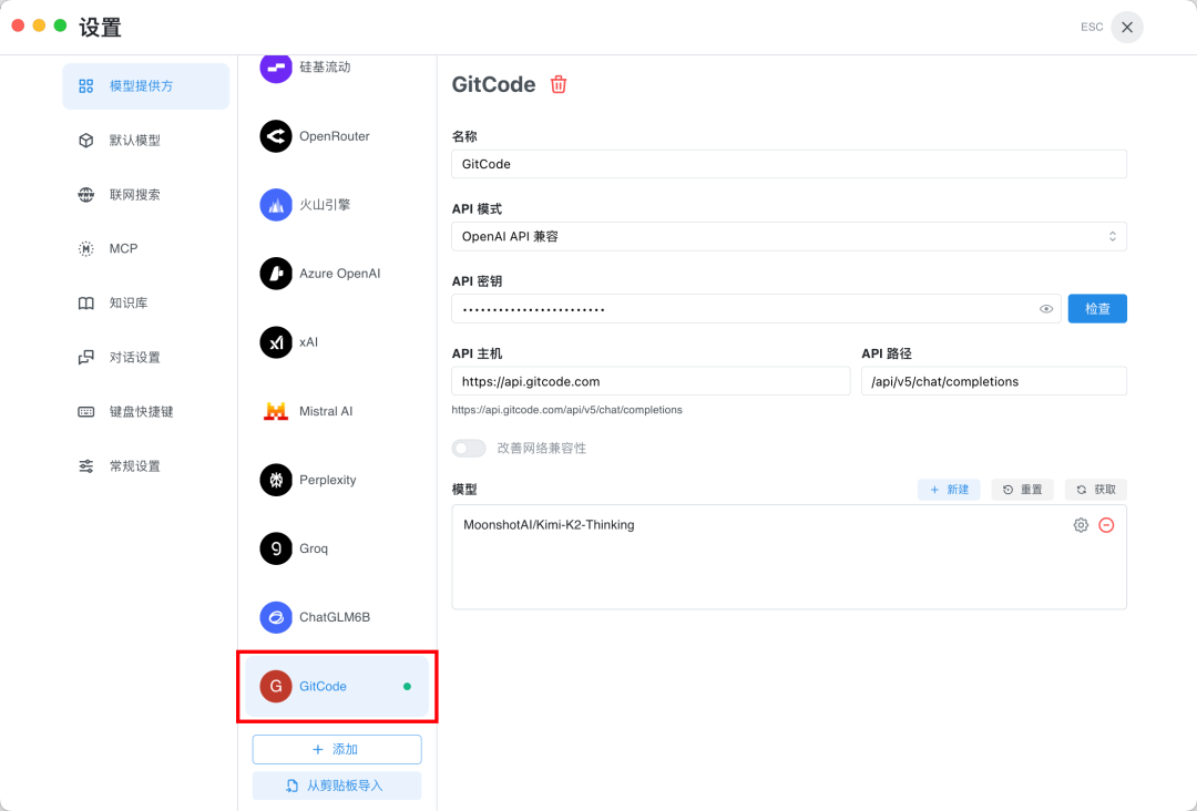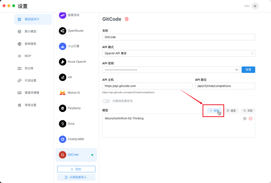 API 地址:输入【https://api.gitcode.com/api/v5/chat/completions#】