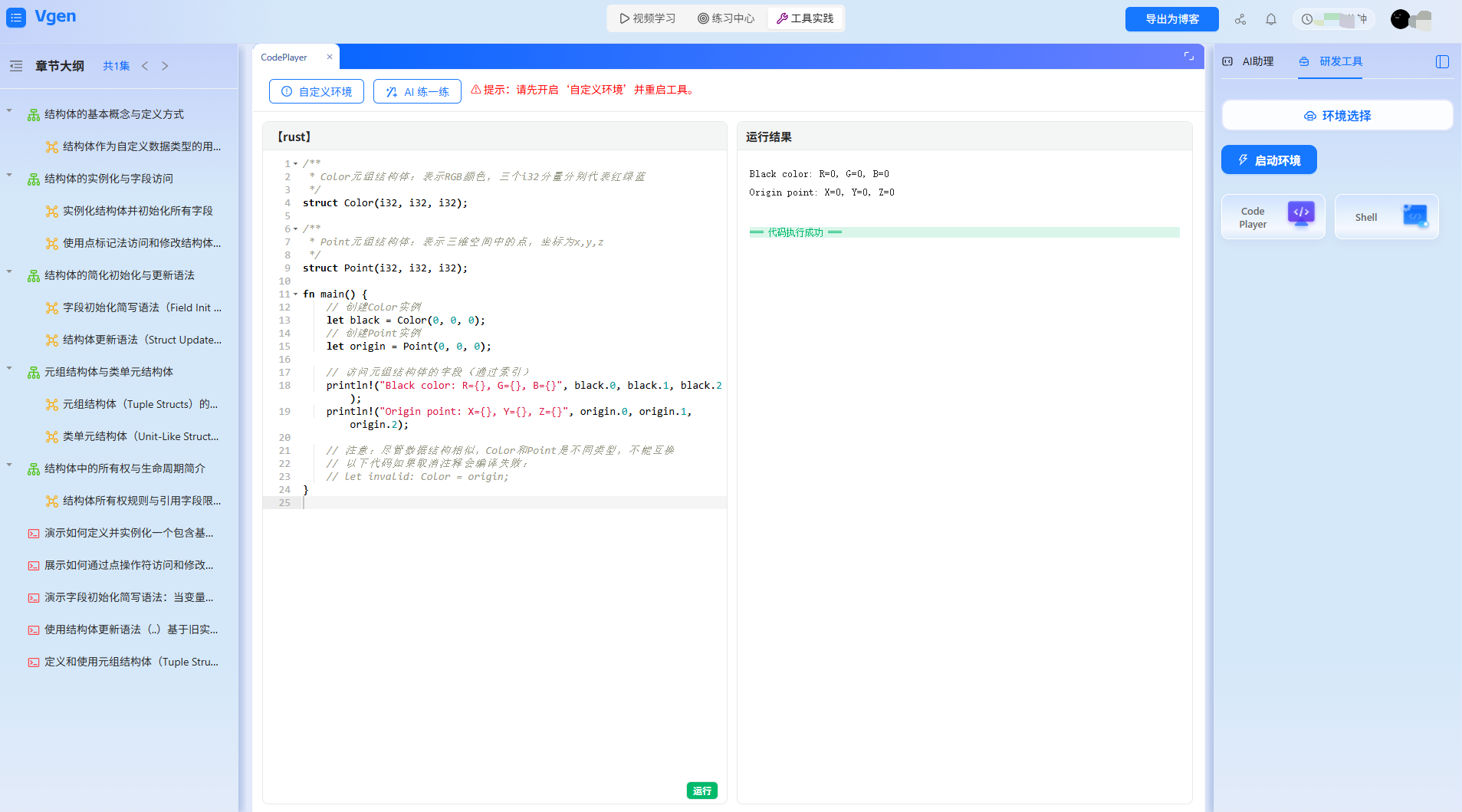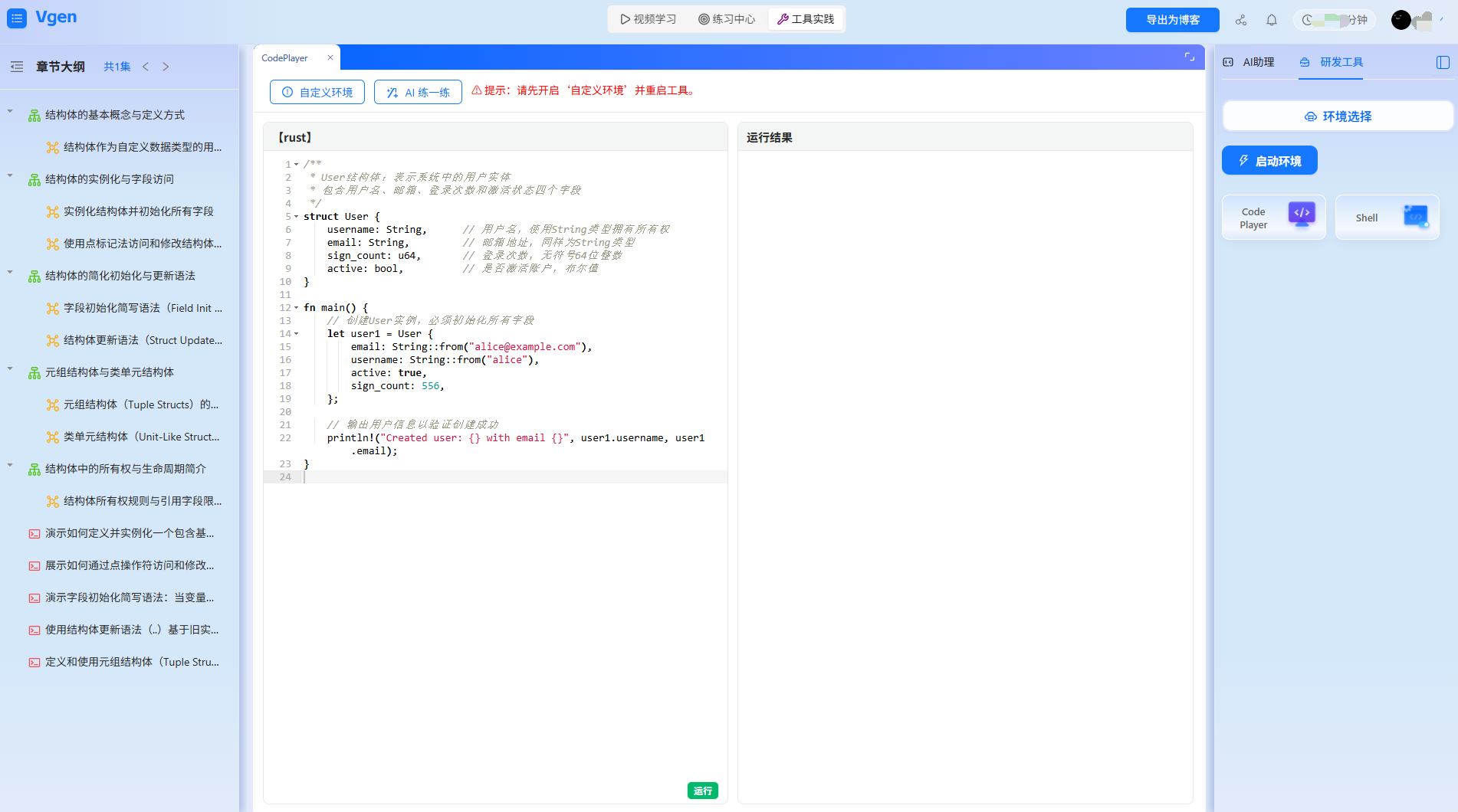 Rust struct的规则多(如可见性、所有权、方法绑定),新手很容易“似懂非懂”——比如知道“更新语法”,却不知道“移动语义的影响”;会写方法,却分不清&self和&mut self的用法。Vgen的AI自测能针对这些痛点出题,帮你精准补漏,避免“学完就忘、写了就错”。