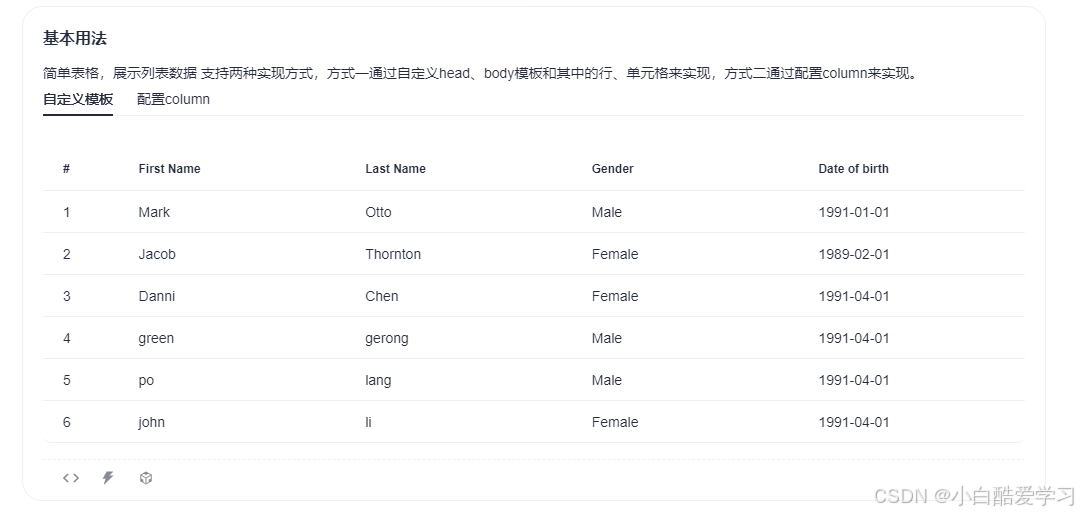 比如:基本用法-简单表格,展示列表数据 支持两种实现方式,方式一通过自定义head、body模板和其中的行、单元格来实现,方式二通过配置column来实现。