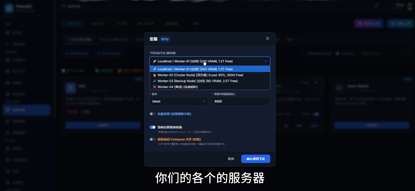 - 多节点管理:一台主机 → 多台服务器,下拉选择目标节点部署