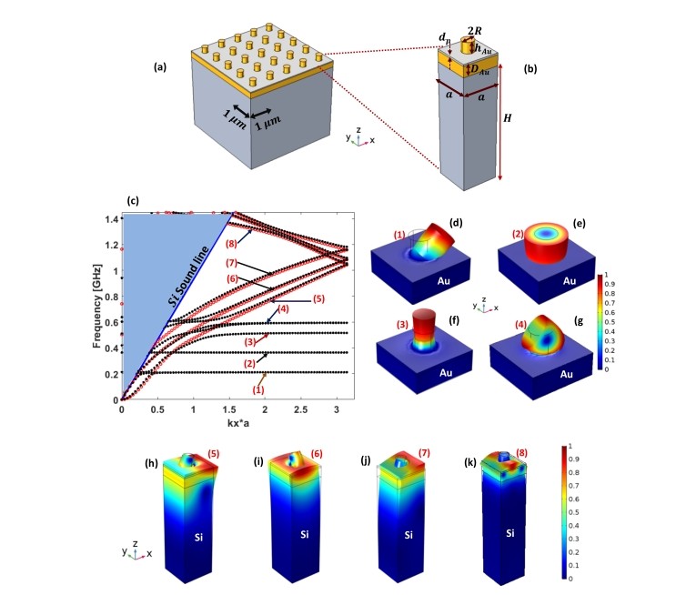 声子晶体声表面波-等离子激元效应仿真案例文献复现Surface acoustic waves-localized plasmon interaction in pillared phononic crystals