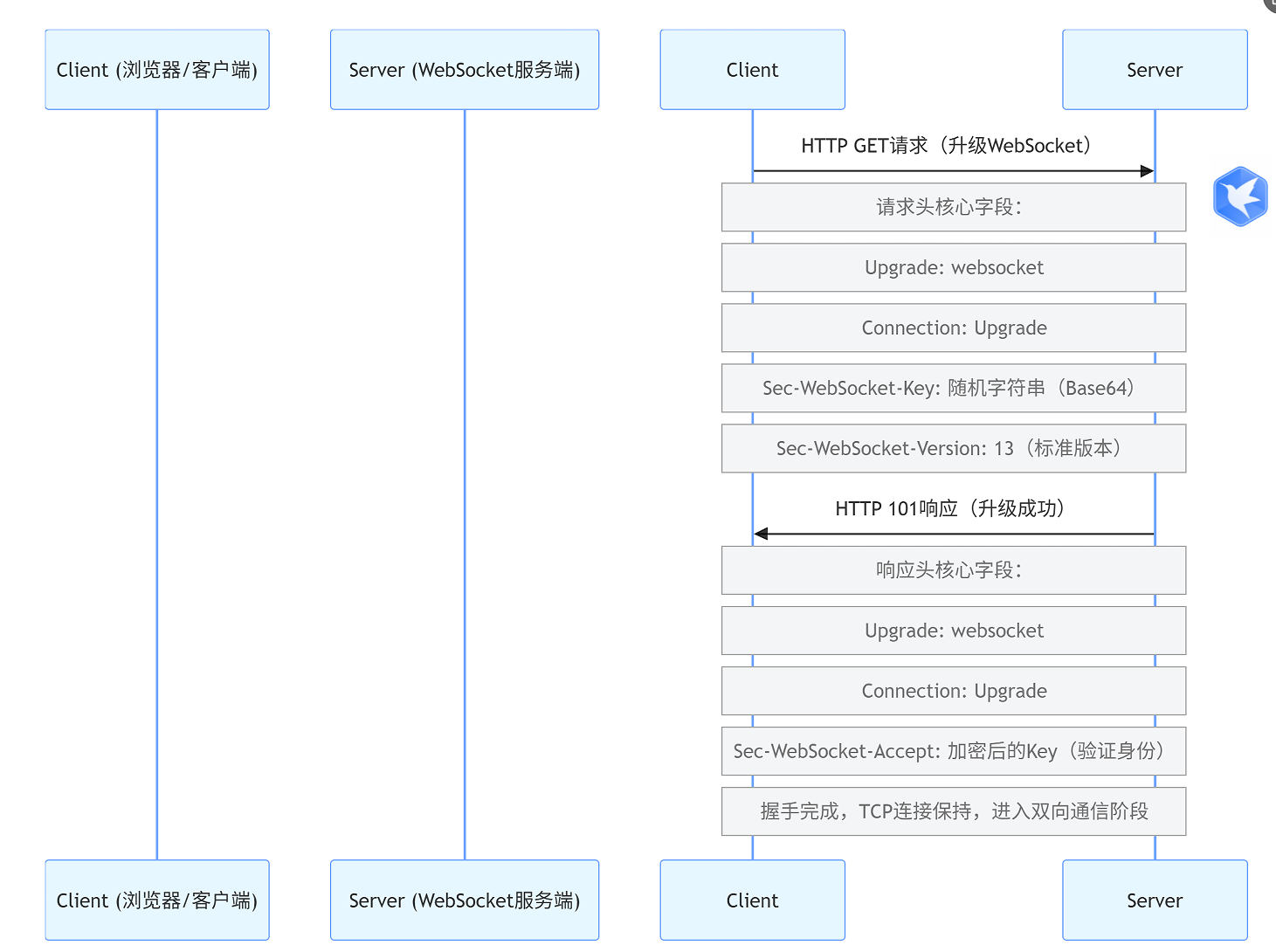 WebSocket 连接基于 HTTP 协议 “升级” 而来,全程仅 1 次握手,流程如下: