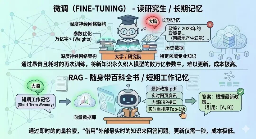 这个是长期记忆 vs 短期记忆的问题,很多人问:既然模型知识旧,我直接重新训练(微调)它不就行了吗? Linuxera 的深度博文给出了一个非常感性的解释:微调像“读研究生”,而 RAG 像“随身带百科全书”。