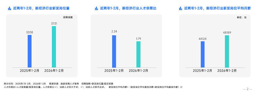 《洞察》显示,2026年1-2月,新经济行业新发岗位量同比增长12.77%,招聘需求明显回温。与此同时,人才供需比从2025年同期的2.24下降至1.79,即从“约2.24人竞争1个岗位”下降至“约1.79人竞争1个岗位”,求职竞争压力有所缓解。