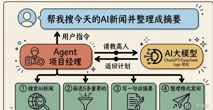 当你说"帮我搜今天的 AI 新闻并整理成摘要",Agent 会带着你的消息去找大模型,大模型想了想,给出了一个"执行计划":