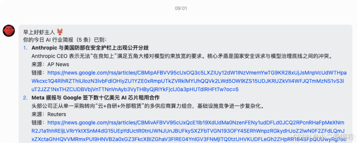 这是最经典的入门任务。你只需要说一次,之后每天早上打开飞书就能看到。背后发生了什么,你现在很清楚了:它自己定时醒来(心跳)→ "项目经理"安排"手脚"去搜新闻 → 整理好结果 → "前台"发回你的飞书。
