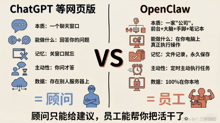 一句话总结:ChatGPT 是顾问,OpenClaw 是员工。 顾问只能给建议,员工能帮你把活干了。
