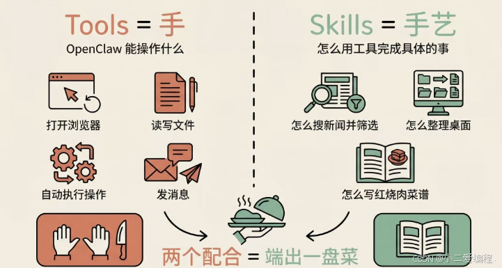 打个比方:Tools 是你有一双手和一把菜刀,Skills 是红烧肉的菜谱。 光有手和刀不知道该怎么做菜,光有菜谱没有手也做不了——两个配合才能端出一盘菜。
