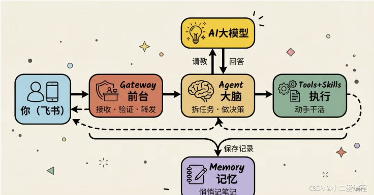 | Gateway | 公司前台 | 接收你的消息,验证身份,转发给大脑,结果送回给你 |
