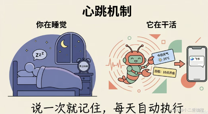 普通 AI 都是你问它才答。但 OpenClaw 有个"心跳"机制——每隔一段时间,它会自己醒来看看有没有该做的事。