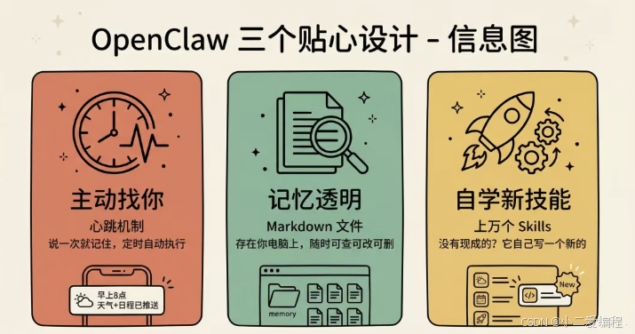 这就是和普通聊天 AI 最大的区别之一。ChatGPT 关掉窗口就忘了你说过什么,但 OpenClaw 有自己的"笔记本",而且永远不会丢。