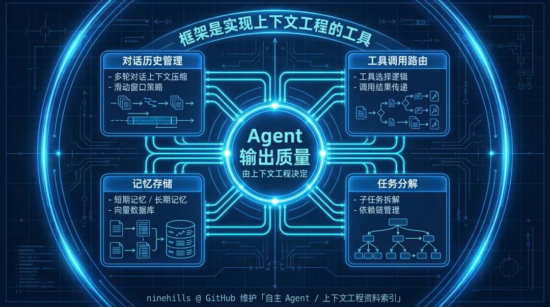 上下文工程四大要素:对话历史管理、工具调用路由、记忆存储、任务分解,中心是 Agent 输出质量