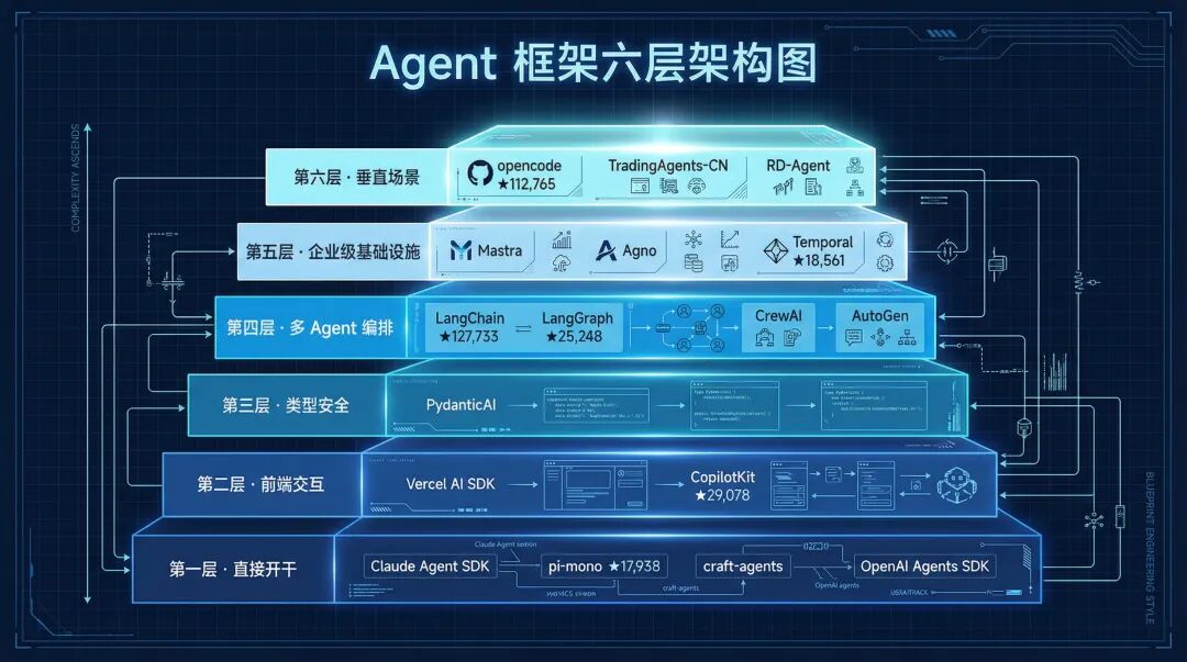 Agent 框架六层架构图:从底层直接开干到顶层垂直场景,复杂度逐层递增