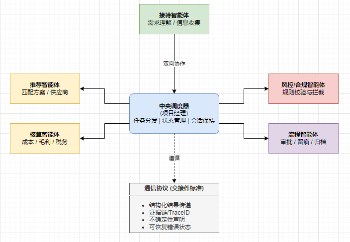 - 专业分工:接待智能体(理解需求、收集信息)、推荐智能体(匹配方案/物料/供应商)、核算智能体(成本、毛利、税务口径)、流程智能体(审批、留痕、归档)、风控/合规智能体(规则校验与拦截)等。