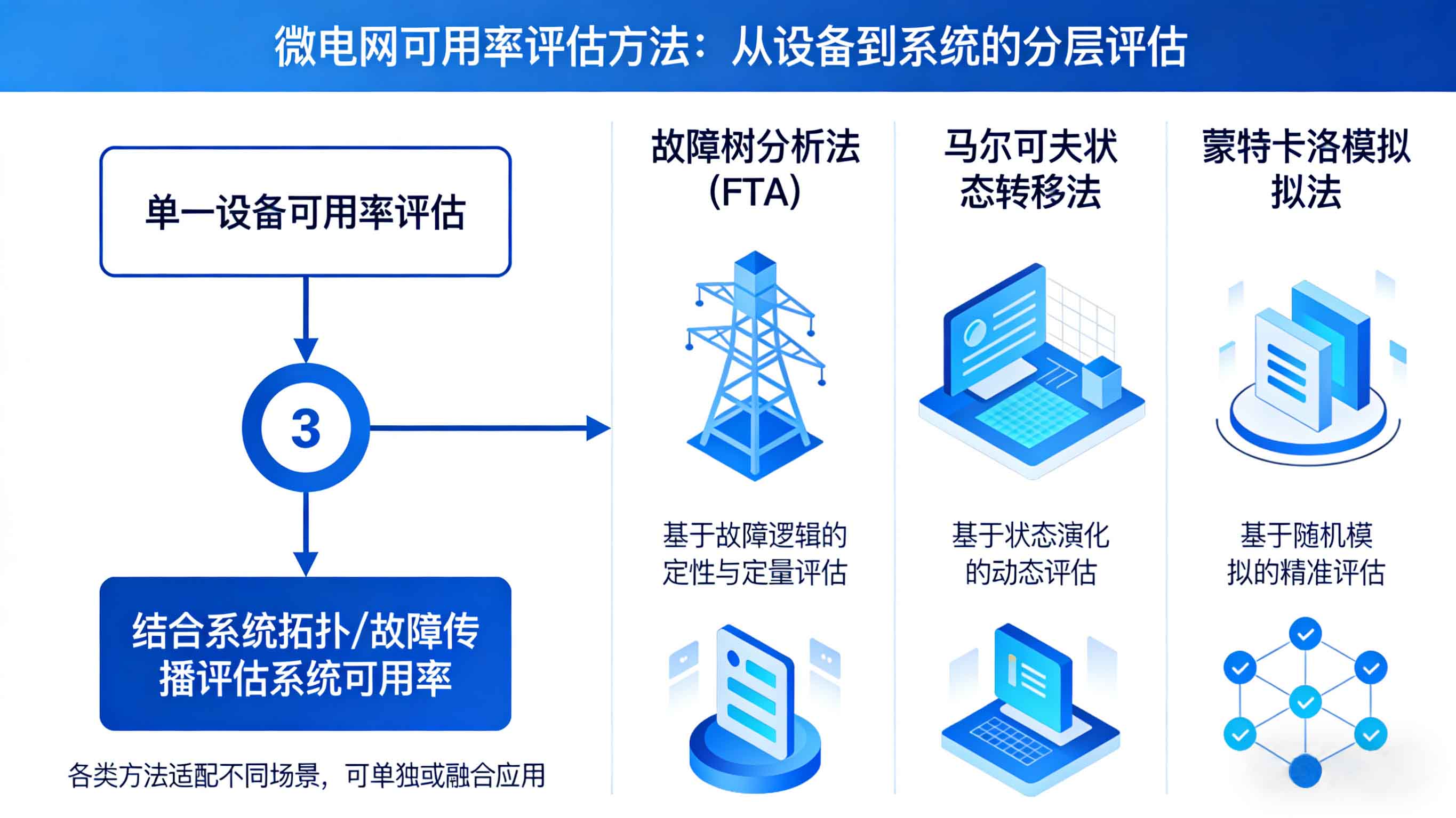 微电网可用率的评估遵循“分层评估、综合汇总”的思路,先评估单一设备的可用率,再结合系统拓扑结构、故障传播规律,评估系统整体的可用率,核心方法包括故障树分析法、马尔可夫状态转移法、蒙特卡洛模拟法三大类,各类方法适配不同的评估场景,可单独使用或融合应用。