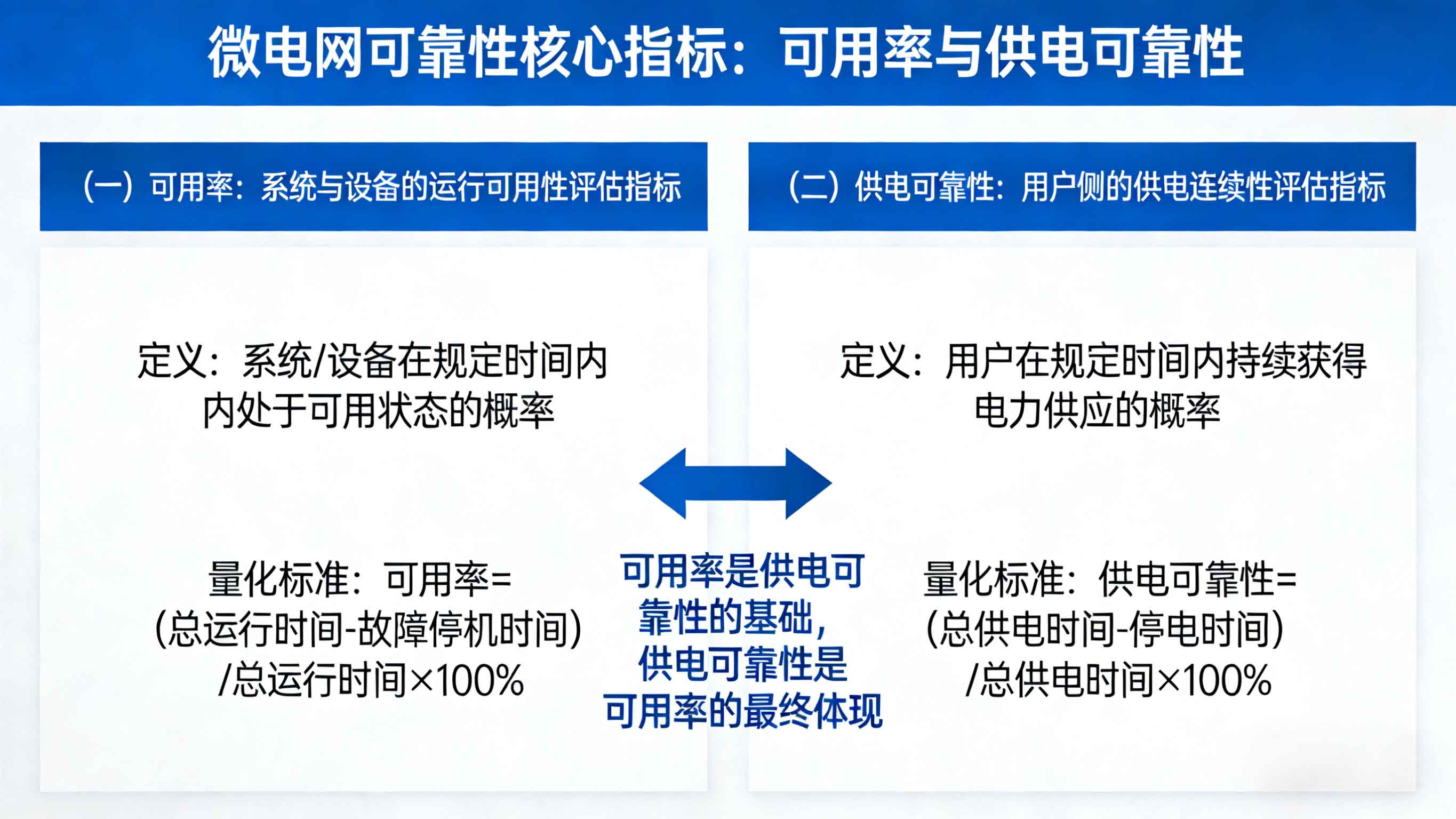 可用率与供电可靠性是微电网可靠性评估的两大核心指标,二者既有区别又有联系——可用率是供电可靠性的基础,只有系统与设备具备较高的可用率,才能为供电可靠性提供保障;供电可靠性是可用率的最终体现,其水平直接反映微电网的实际供电能力。明确二者的定义与量化标准,是开展可靠性评估的前提。