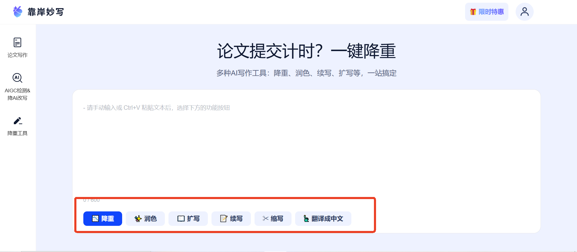 - 计时降重: 上传查重报告,AI自动识别飘红部分,进行同义复述和句式变换。