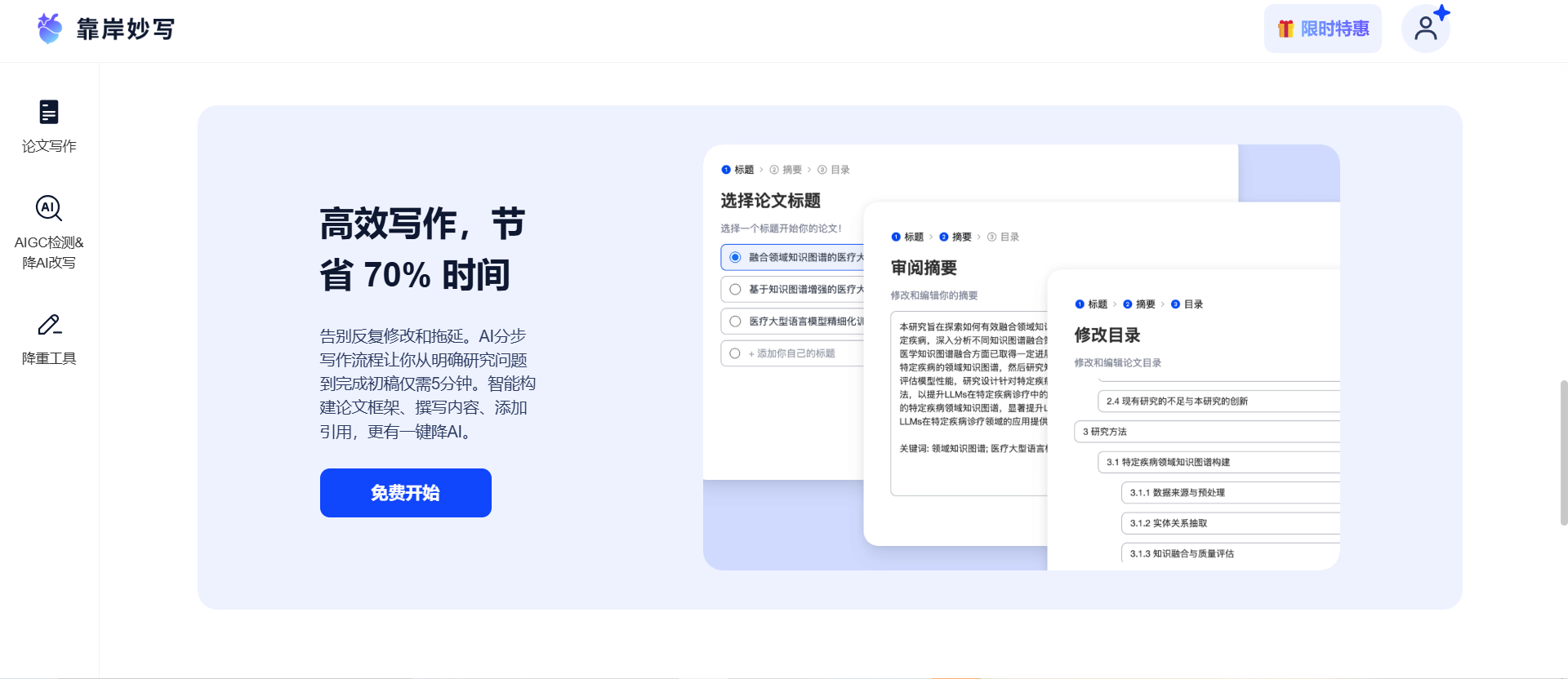 | 时间紧张型 | 效率第一,快速成稿 | Scholingo靠岸妙写 | 从选题到定稿一站式解决,节约超过80%的时间。 |