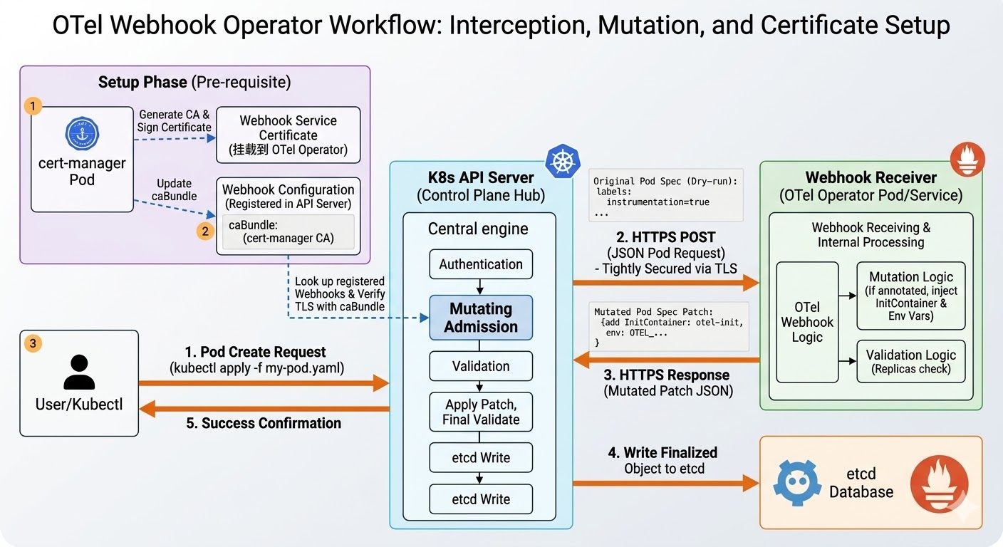其中有一关叫做 Mutating Admission(变更准入)。 OTel Operator 在安装的时候(其实是 cert-manager 帮它签发证书的时候),向 K8s API Server 注册了一个自己的“哨卡”(Webhook)。