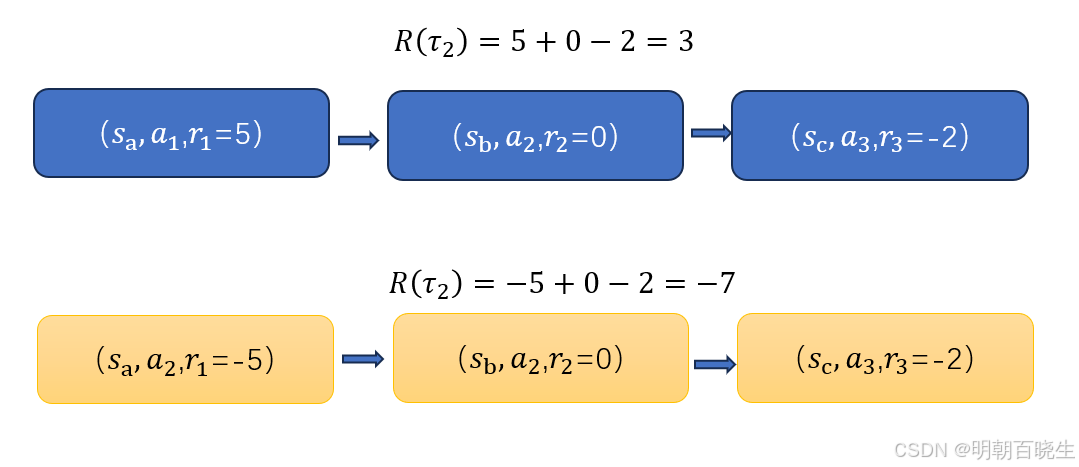 而在轨迹2中,同样的状态 sb和执行同样的动作 a2,由于后续轨迹的不同(或环境随机性),导致总回报为负(-7),因此这一行为会被抑制。