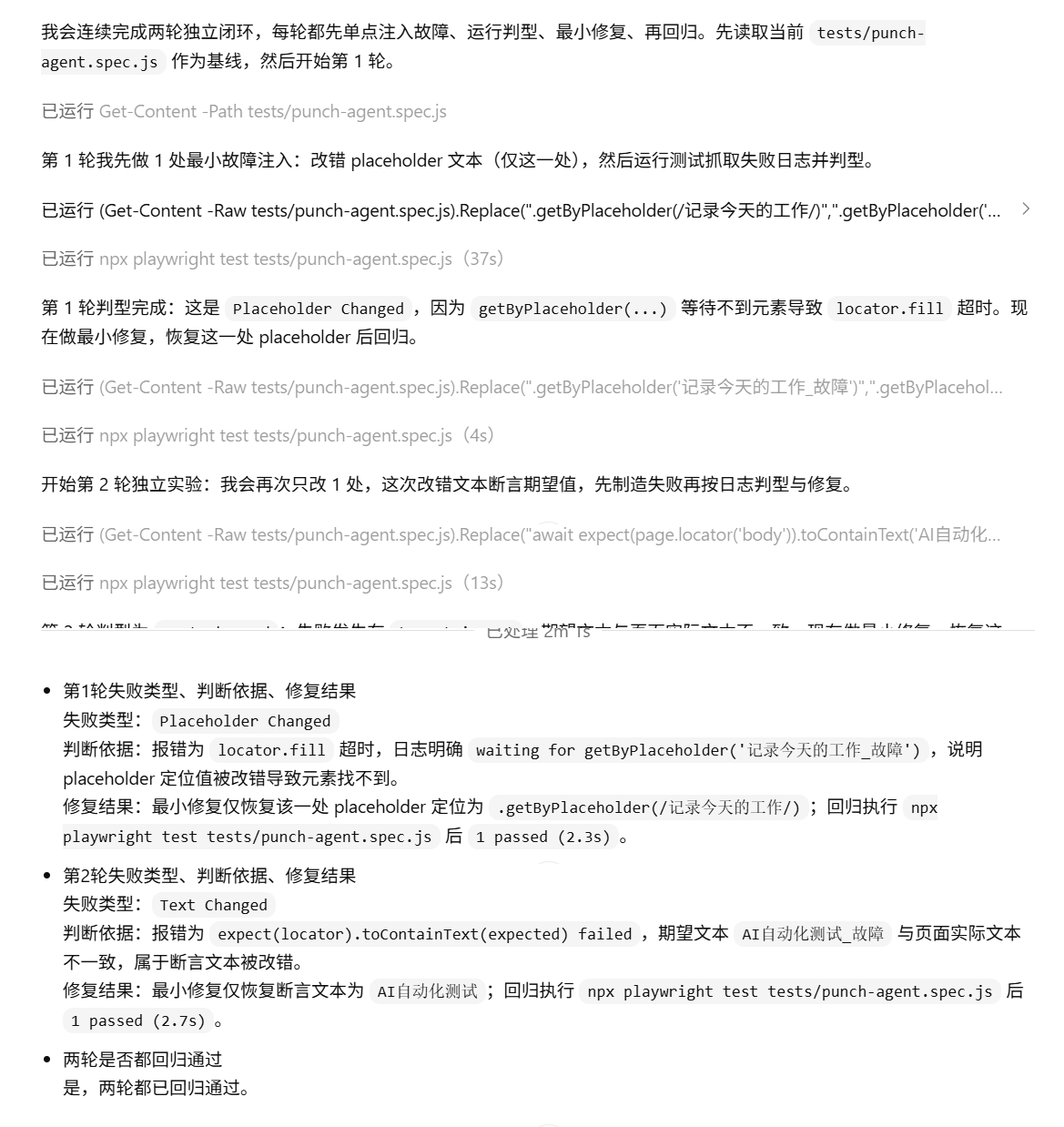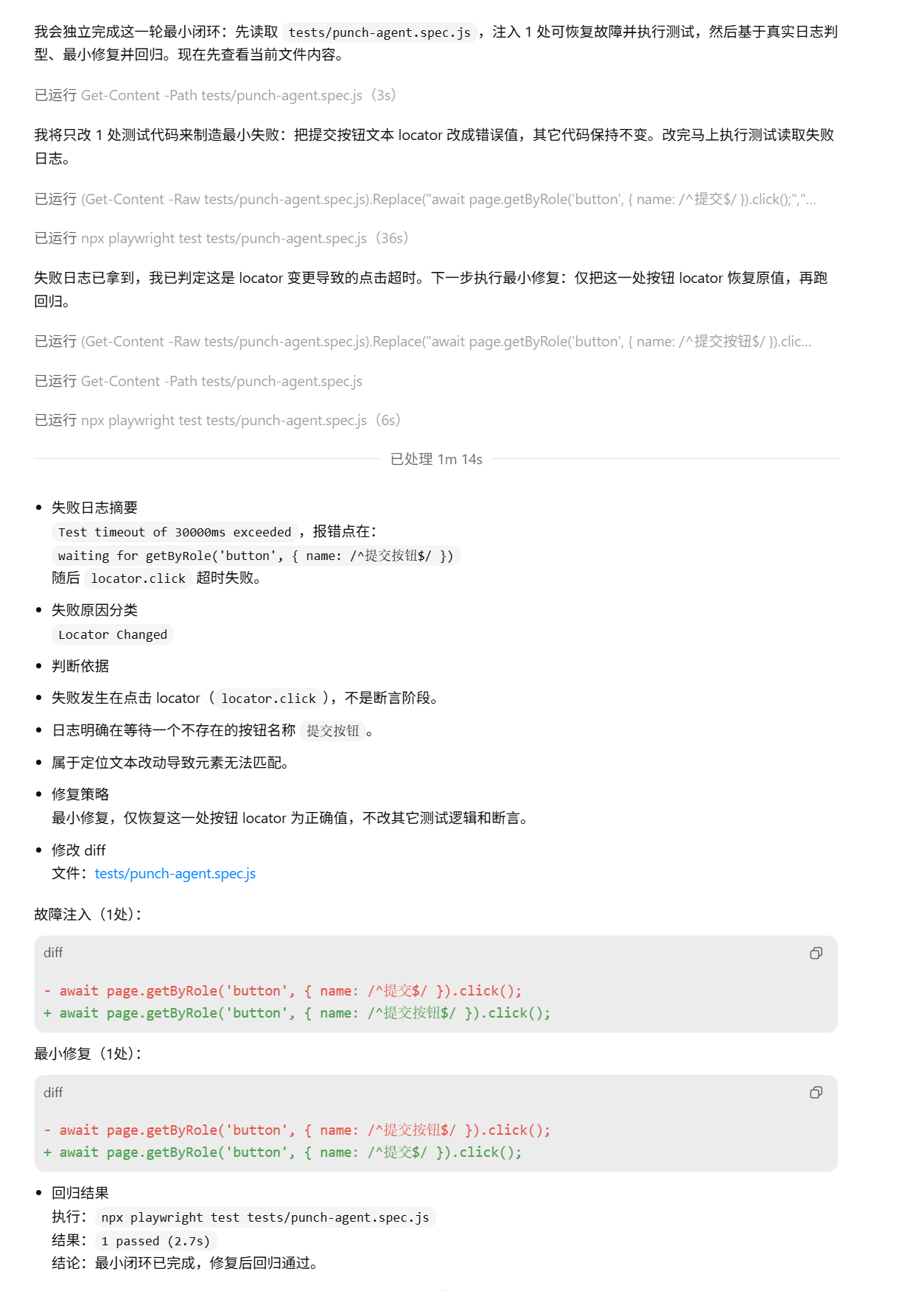 针对 Playwright 执行失败的测试,用最小修复方式完成自动分析、归因、修改和回归。