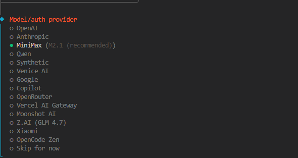 AI模型选择, 这里我选择MiniMax, 按提示输入Api key进行配置