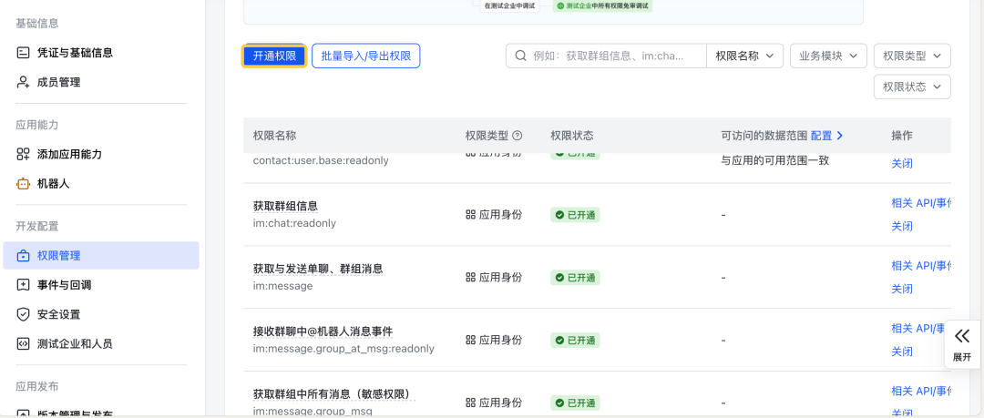 - 开通相关权限: