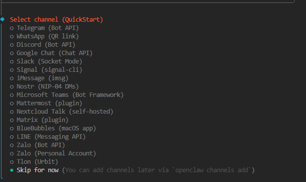 Channel 选择,默认集成的都是国外的平台,这里先直接跳过,后面再通过插件的方式接入飞书: