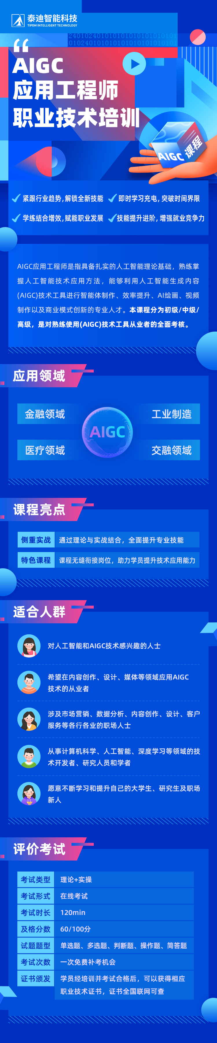 各类AIGC人才培养项目正如火如荼开展。获得权威机构颁发的AIGC应用工程师证书,不仅能系统提升专业技能,更是求职时的重要加分项。