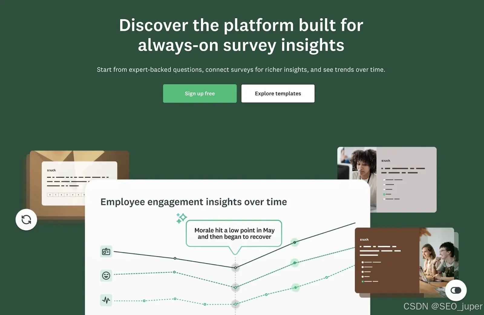 随着访客向下滚动,着陆页突出展示使用SurveyMonkey的具体优势,帮助访客了解其不同功能。