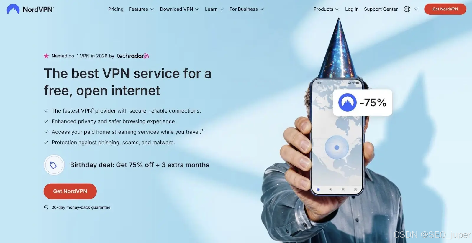 NordVPN的VPN服务登陆页面以醒目标题开篇,彰显其市场领导者地位,配套文案则着重强调隐私保护与安全保障等核心优势。