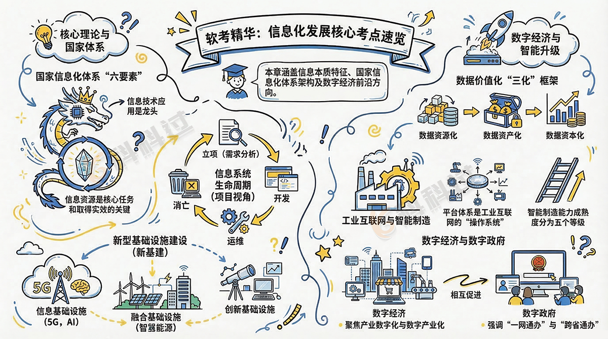 中级软考的备考,最怕的就是基础不牢。第一章作为信息化与数字经济的基础理论,是后续项目管理学习的核心基石。历年大概考试占分1~2分; 但新基建、工业互联网、数字中国等高频概念每年都在单选题中稳定出现,属于必须拿下的“送分题”。