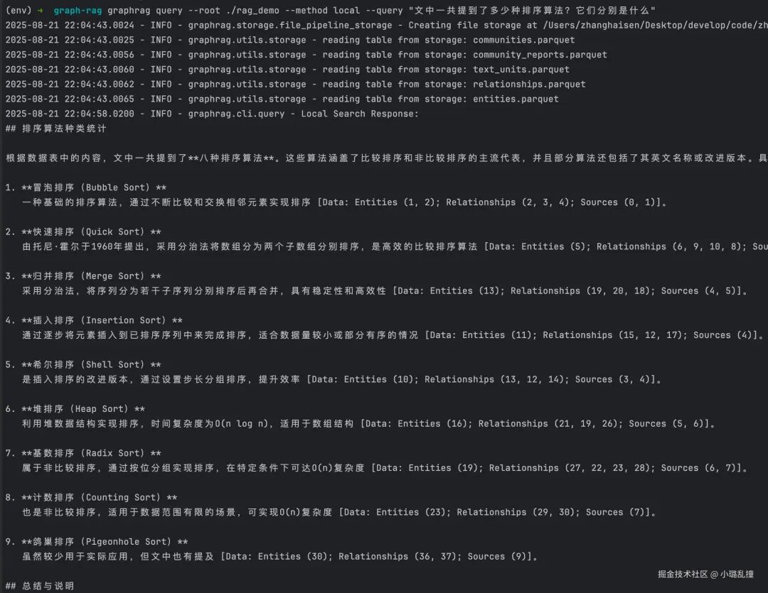 graphrag query --root ./rag_demo --method local --query "文中一共提到了多少种排序算法?它们分别是什么"