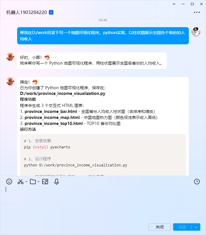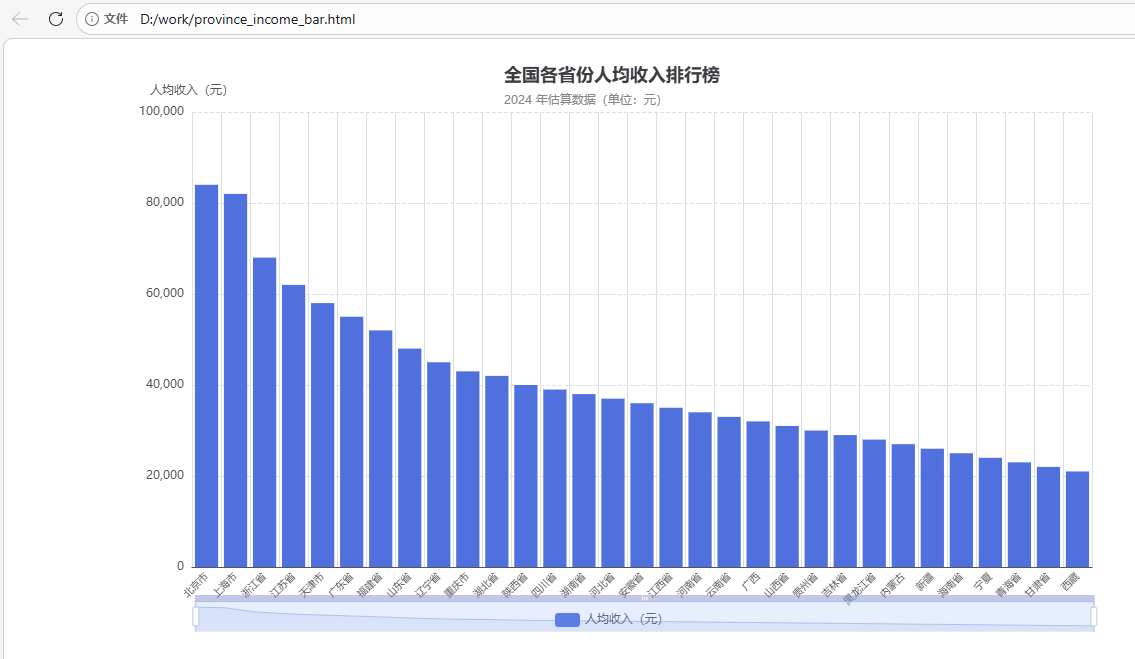 更绝的是,我让它在D:/work目录下写一个Python地图可视化程序,用柱状图展示全国各省份人均收入,它立马生成了程序文件,还附带运行方法和3个交互式HTML图表,全程不用我写一行代码!