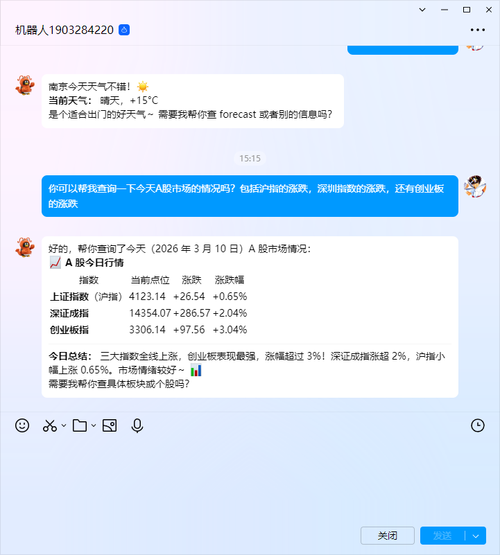 对接成功后,我在QQ里让机器人查询今天A股市场的收盘情况,后台立马接收任务并完成查询,手机上直接看到详细结果: