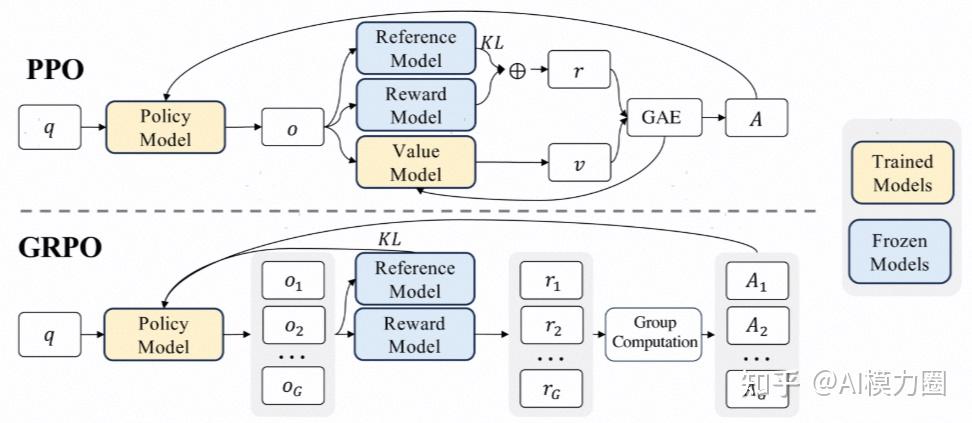 群组相对策略优化(GRPO,Group Relative Policy Optimization)通过组内奖励标准化省去价值函数,与PPO相比架构图如下: