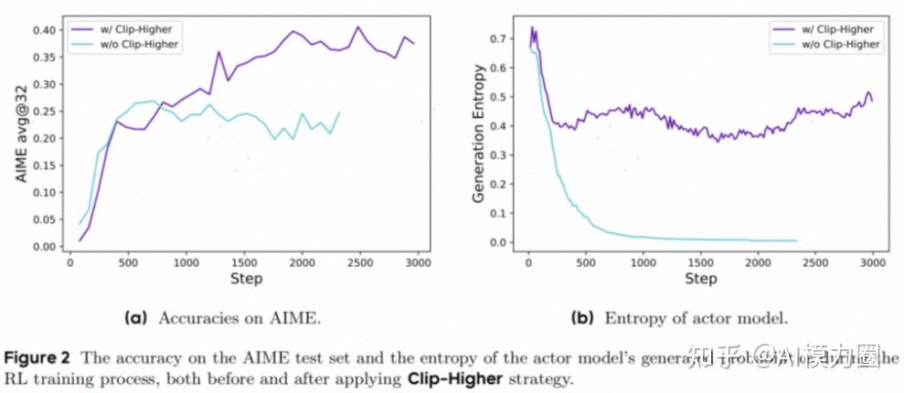 - 子图(b):actor 模型的熵值中,应用前(蓝色曲线):熵值在训练初期快速下降,出现熵坍塌现象(模型输出趋同)。应用后(紫色曲线):熵值维持在较高水平(约0.4),表明模型保持了输出多样性。表明,Clip-Higher通过解耦剪裁范围(εhigh > εlow),抑制了高概率token的过度主导,促进低概率token的探索,避免了熵坍塌。