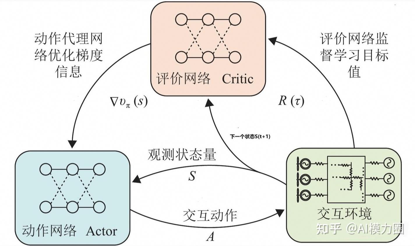 Actor-Critic是一种结合策略优化(Actor)和值函数评估(Critic)的强化学习框架。其核心思想是通过两个组件的协同工作实现高效学习: - Actor(策略网络):负责生成动作的概率分布,通过策略梯度更新参数以最大化长期回报