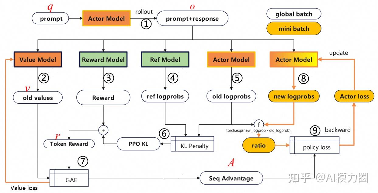 - Actor Loss计算:在每个mini batch中根据new_logprobs和old_logprobs以及优势函数计算损失,对Actor进行更新