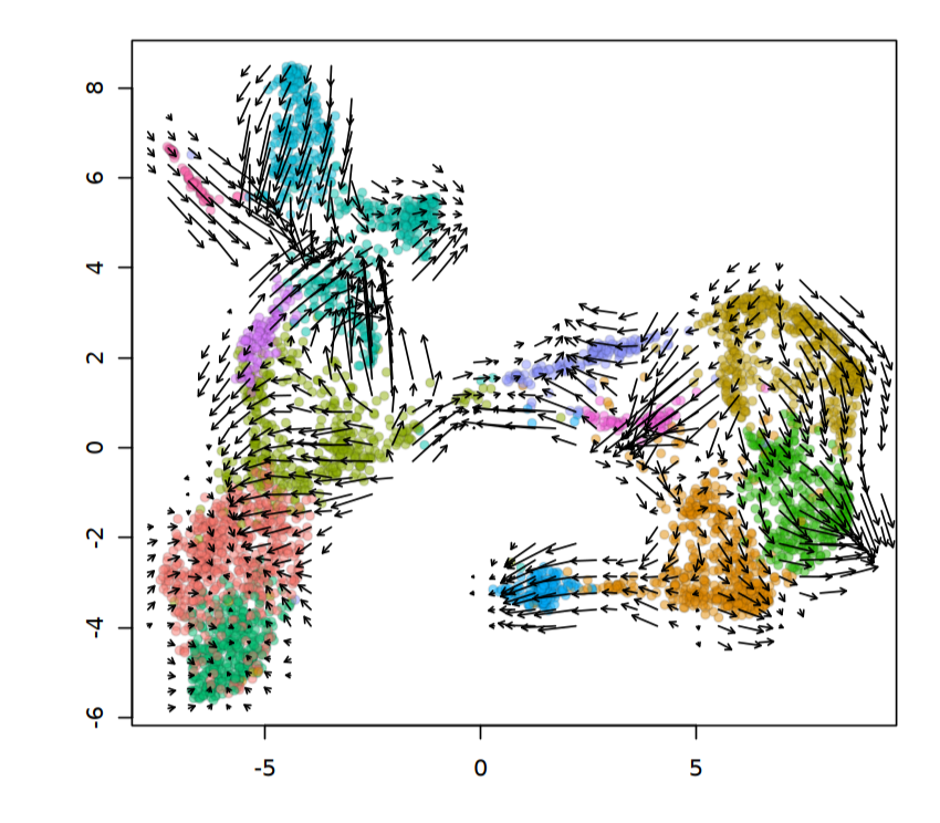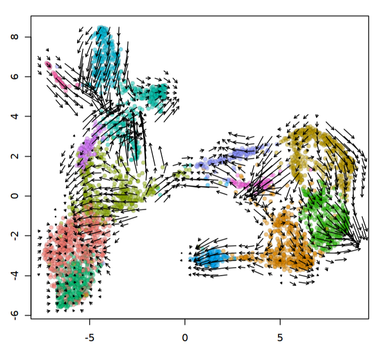 show.velocity.on.embedding.cor(emb = emb, vel = vel, n = 200, scale = "sqrt",