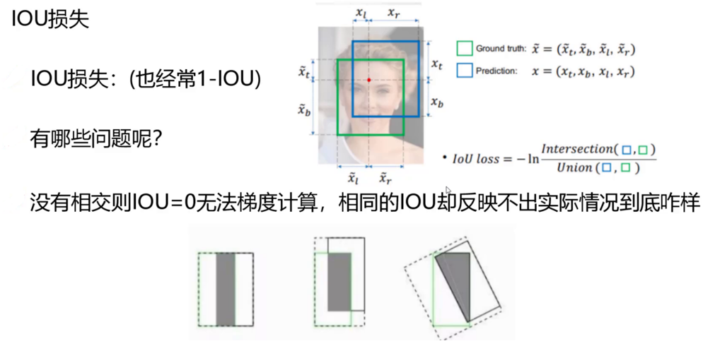 传统的 IOU 损失(通过计算预测框与真实框的重叠面积来衡量误差)有明显缺陷:如果两个框没有重叠,模型就没法通过损失调整参数;而且就算重叠度一样,也区分不了框的位置好坏。